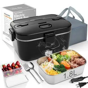Electric-Lunch-Box-Heated-Food-Warmer 100W Heating Lunchbox for Adults 1.8L Portable Food Heater for Work/Car, 12V/24V/110-230V Lonchera Eléctrica Portátil with Fork Spoon (Black)