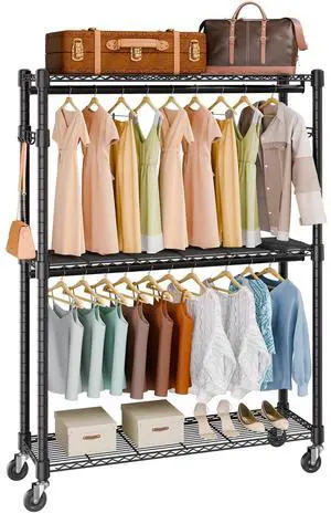 Heavy Duty Clothes Rack, Rolling Clothing Garment Rack with 3 Storage Tiers, 2 Rods and 2 Pairs Side Hooks, Adjustable Height Clothing Rack Closet for Hanging Clothes, 400 Lbs Load Capacity