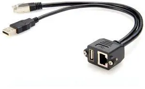 Generic Dual USB 2.0 RJ45 Cat5e Ethernet Combo Extension Cable RJ45 8P8C USB Type-A Male to Female Screw Panel Chassis Feedthrough Cable