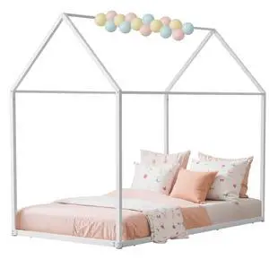 VEVOR Twin Size House Bed Frame Metal Kids Floor Bed Frame with Roof White
