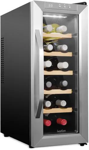 Ivation 12 Bottle Thermoelectric Wine Cooler/Chiller - Stainless Steel - Counter Top Red & White Wine Cellar w/Digital Temperature, Freestanding Refrigerator Smoked Glass Door Quiet Operation Fridge