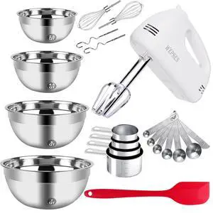 5-Speed Electric Hand Mixer, 4 Large Mixing Bowls Set, Handheld Mixers with Whisks Beater, Stainless Steel Metal Nesting Bowl Measuring Cups Spoons Kitchen Cake Blender for Baking Supplies