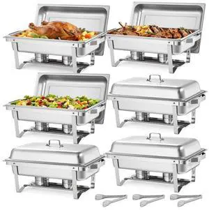 VEVOR Rectangle Chafing Dish, 9 Qt 6 Pack Stainless Steel Chafing Dish, Food Warmer Chafer Complete Set with Hollow Handle, 3 Food Tongs, Lid, Fuel Holder, Chafer Dishes for Banquet Party Wedding