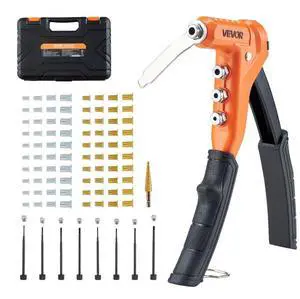 Vevor Pop Rivet Gun Kit, with 200 Blind Rivets, Heavy Duty Single Hand Riveter with 4 Interchangeable Nosepieces, 4 Drill Bits, and a Carrying Case, Manual Riveting Tool for Metal, Automotive, Home