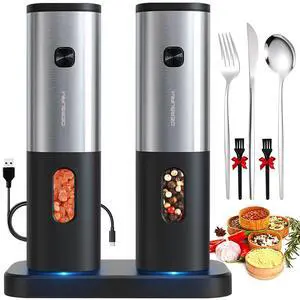 Rechargeable Electric Salt and Pepper Grinder Set with Charging Base, DERGUAM Stainless Steel Pepper Grinder with Adjustable Coarseness and Led Light