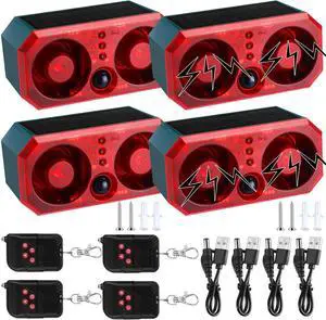 Qualirey 4 Pcs Solar Outdoor Motion Sensor Alarm Motion Sensor Animal Deterrent Dog Barking Alarm 13 Sound 130db Loud Noise Maker 4 Mode with USB Remote Control Support Recording Volume Adjustment