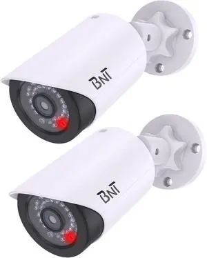 BNT Solar Powered Fake Security Camera, Bullet Shape Fake Surveillance Camera with Red LED Light for Night, Security Warning Sticker, for Outdoor Safety Alert (White 2Pack,Battery not Included)