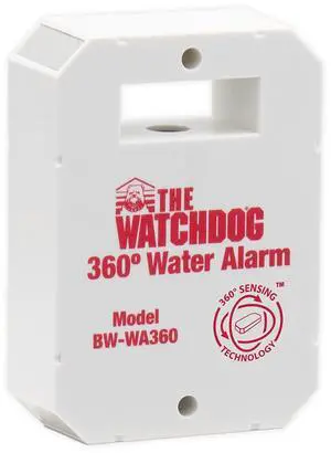 Specifications: THE BASEMENT WATCHDOG Model BW-WA360 110 dB Battery Operated Water Alarm, THE BASEMENT WATCHDOG, BW-WA360, 2.375 L x 1 W x 3.25 H inches, 9 volts, Battery Powered, Alkaline, 110 decibels, Contact Sensor, Wall Mount, Pit Mount, Floor Mount, None, Various water-prone devices and areas