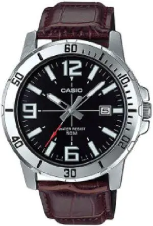 Casio Mens Analog Black Steel Dial Leather Brown Band Water Resistant Watch MTP-VD01L-1BVUDF