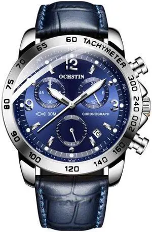 OCHSTIN 6123C Multifunctional Quartz Waterproof Luminous Men Leather Watch (Silver Blue) Black