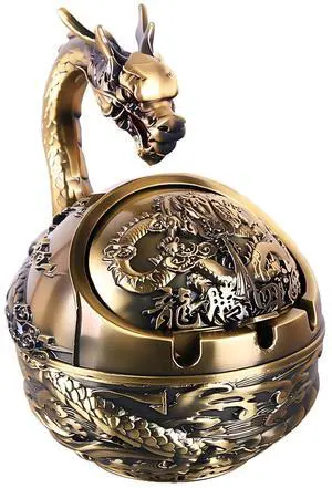 Vintage Ashtray with Lid for Cigarettes,Metal Windproof Smokeless Odorless Ash Tray Holder for Indoor Outdoor Decorative Hand-Carved Fancy Gift Ornament for Home Office (Bronze Dragon)