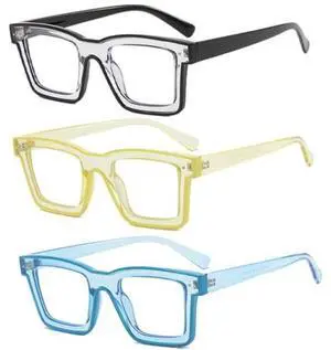 bullabulling 3pack Oprah style Readers Blue Light Blocking Computer Square Reading Glasses for Women Men TR90 (blackclear/yellow/blue, 2.75, multiplier_x)
