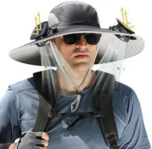 Solar Fan Hat, Wide Brim Solar Fan Outdoor Fishing Hat with Removable Neck Flap and Face Cover for Fishing, Hiking, Camping Grey