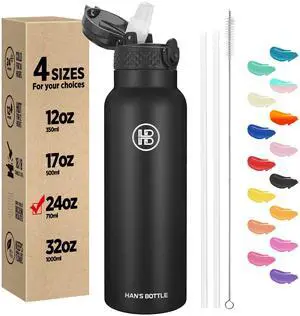 Sports Water Bottle - 24 Oz, Straw Lid, Leak Proof, Vacuum Insulated Stainless Steel, Double Walled, Thermo Mug,Black