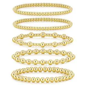 Gold Bracelets for Women, 14K Gold Plated Beaded Stretch Bracelet Strand Bead Ball Bracelets stack Set Trendy Adjustable Non Tarnish Jewelry Sets for Womens Gifts