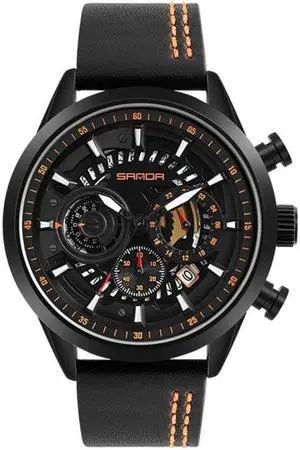 SANDA 5010P Six-Pin Cool Big Dial Waterproof Three-Eye Men Watch Leather Strap Fashion Trend Men Watch(Orange) (Black)