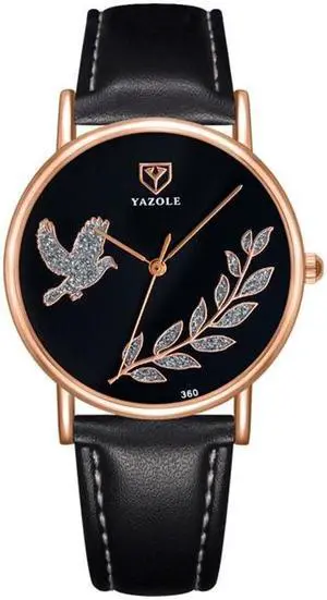 YAZOLE 360 Leather Band Dove of Peace Diamond Lady Watch (Black+Black)