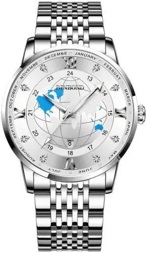 BINBOND B1117 30M Waterproof Earth Dial Butterfly Buckle Luminous Quartz Watch (White Steel-White)