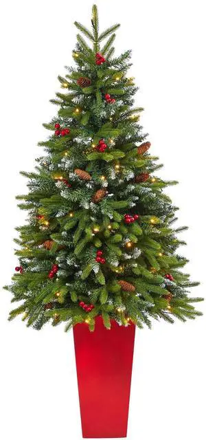 Nearly Natural 62" Snow Tipped Christmas Tree w/100 LED in Red Planter