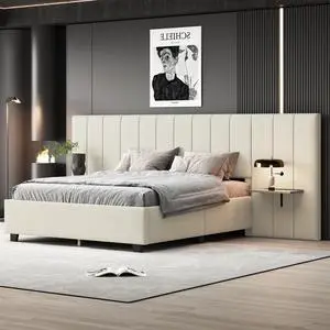 Queen Size Upholstered Platform Bed with Big Headboard, Bedroom Furniture, Velvet, Beige