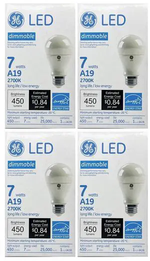 (case of 4 bulbs) GE 11332 - LED A19, 7 watts, 450 lumens, 2700K warm white, Dimmable, LED7DA19/827 LED Light Bulb