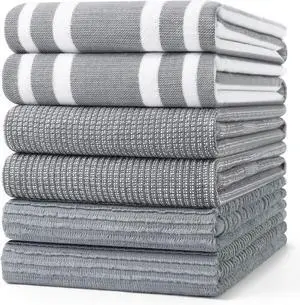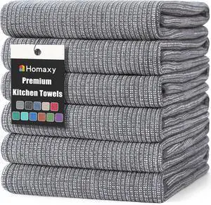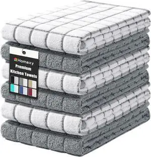 Premium Cotton Kitchen Towels 16x 28 Large Natural Ring Spun 390 GSM Dish Towels Super Absorbent Terry Kitchen Hand Towels Soft Tea Towel with Hanging Loop Grey Check Design 6 Pack