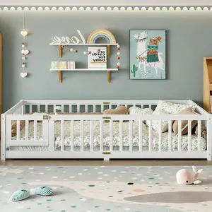 Unique Design, White Fabric and Solid Wood Legs Upholstered Bed Frame,King