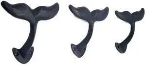 Navy Blue Whale Tail Cast Iron Wall Hooks, Wall Mounted Decoration, Beach Themed Wall Décor, Set of 3, 4.5 Inches High