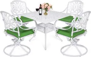 MEETWARM 5-Piece Outdoor Patio Dining Set, All-Weather Cast Aluminum Patio Conversation Set for Backyard Garden Deck with 4 Cushions Swivel Rocker Chairs and 35.4" Square Table, White