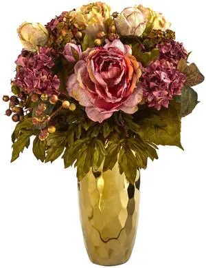 Nearly Natural 19" Peony Artificial Arrangement in Gold Vase
