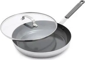 GreenPan x Bobby Flay Stainless Steel 12 Frying Pan Skillet with Glass Lid, Professional Grade Tri Ply, PFAS-Free Ceramic Nonstick, Induction Suitable, Dishwasher & Oven Safe, Stay Cool Handle