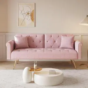 A 69.7-inch-long sofa bed covered in pink velvet fabric, featuring nail head trim and accompanied by a matching throw pillow