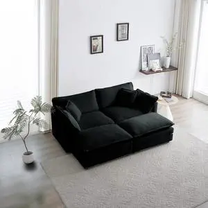 4 - Piece Upholstered Sectional Sofa, 1 - Piece of 2 Seater Sofa and 2- Piece of Ottomans , 2 Seater Loveseat Lounge with Ottomans , Black Chenille
