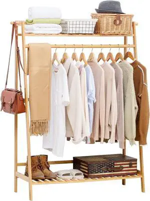 COPREE Bamboo Garment Coat Clothes Hanging Heavy Duty Rack with top Shelf and Shoe Clothing Storage Organizer Shelves