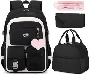qodbopack 3PCS Girls Backpack For College Middle High School Student Teens Women Bookbag Waterproof Laptop Bag Black Beige