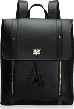 ESTARER Upgraded Version Women PU Leather Backpack 15.6 Inch Laptop Backpack Vintage College Rucksack Bag (Black)