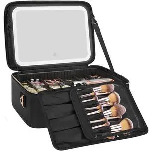 Relavel Travel Makeup Bag With LED Mirror, 16.2" Large Makeup Train Case, 3 Color Scenarios Adjustable Brightness, Waterproof Makeup Train Case Organizer with DIY Dividers for Makeup Artist, Black