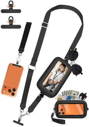 Clip and Go Strap for Phone with Wallet Crossbody, 4-in-1 Adjustable Phone Lanyard with Detachable RFID Wallet with ID Window, Cross Body Strap for Women Travel, Black