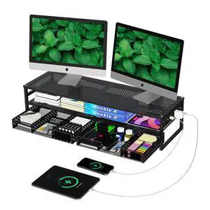 2 Tier Metal Monitor Stand Riser with USB 2.0 and Charging Prot , Computer Office Desktop Organizer for 2 Monitors With Two Drawer Storage and Reusable Cable Ties,for Printer,TV, Black