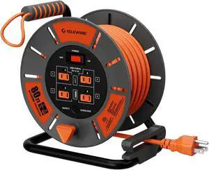 Retractable Extension Cord Reel 80 FT, 14AWG SJTOW Heavy Duty Power Cord with 4 Grounded Outlets, USB-A & USB-C Ports, 13A Circuit Breaker, Hand Crank for Indoor Outdoor Use, ETL Listed, Orange