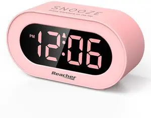 Pink Girls Alarm Clock for Kids Bedroom, Dimmable LED Digital Display, Outlet Powered, Adjustable Volume, Simple to Use, Snooze, Small Size for Bedside, Desk, Toddler