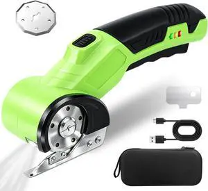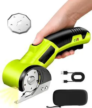 Cordless scissors, 4V rechargeable craft scissors, powerful carpet and cardboard cutting tool, includes replacement blades and charger, safety lock and LED light, storage pouch