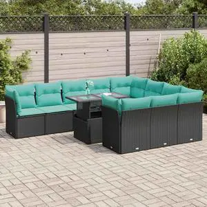 vidaXL 11 Piece Patio Sofa Set with Cushions Black Poly Rattan Acacia