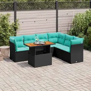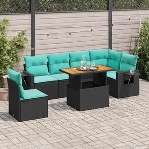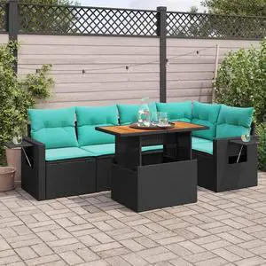 vidaXL 7 Piece Patio Sofa Set with Cushions Black Poly Rattan Acacia