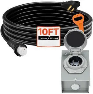 VEVOR 50 Amp Generator Cord and Power Inlet Box, 10FT, 125V/250V STW 6/3 + 8/1 AWG Extension Power Cord, NEMA 14-50P to SS2-50R, Twist Lock Connector, Inlet Box Kit, for Generator to House, ETL Listed