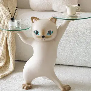 EUREKA UNIQUE Artistic 3D Cat Statue Side Table, Whimsical Animal End Table with Metal Tray, Resin Sculpture Nightstand Decor - 23 Inch