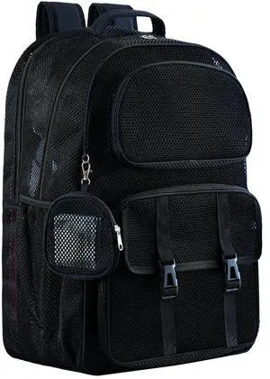 DST Gainbow Mesh Backpack for School, Heavy Duty See Through Net Bookbag for Girls Boys Kids, 27L Large Capacity Mesh Bookbag for Beach Work Sports Travel with Padded Strap(Black)
