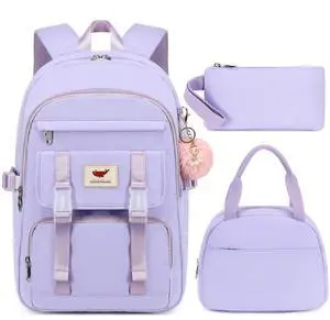 3 PCS Backpack for Teen Girls,Laptop Backpacks 15.6 Inch School Bag with Lunch Box Pencil Pouch Set for Students Aesthetic College Bookbag Travel Daypack(Purple)