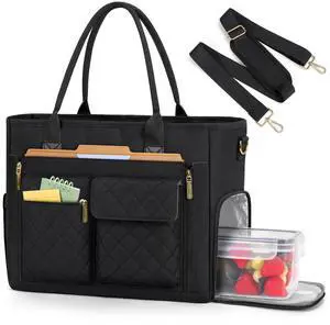 RAINSMORE Teacher Tote Bag with Insulated Lunch Compartment 15.6 inch Laptop Bag for Women Lightweight Work Bags Nurse Bags Professional Briefcase Computer Handbag for Office, College, Nursing, Black