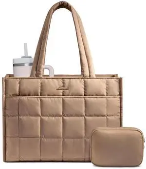 LOVEVOOK Tote Bag for Women, Puffer Work Handbag 15.6 Inch Laptop Purse for Nurse Teacher, Large Quilted Travel Tote Shoulder Bag with Zipper for College Office Clinical Gym, Khaki